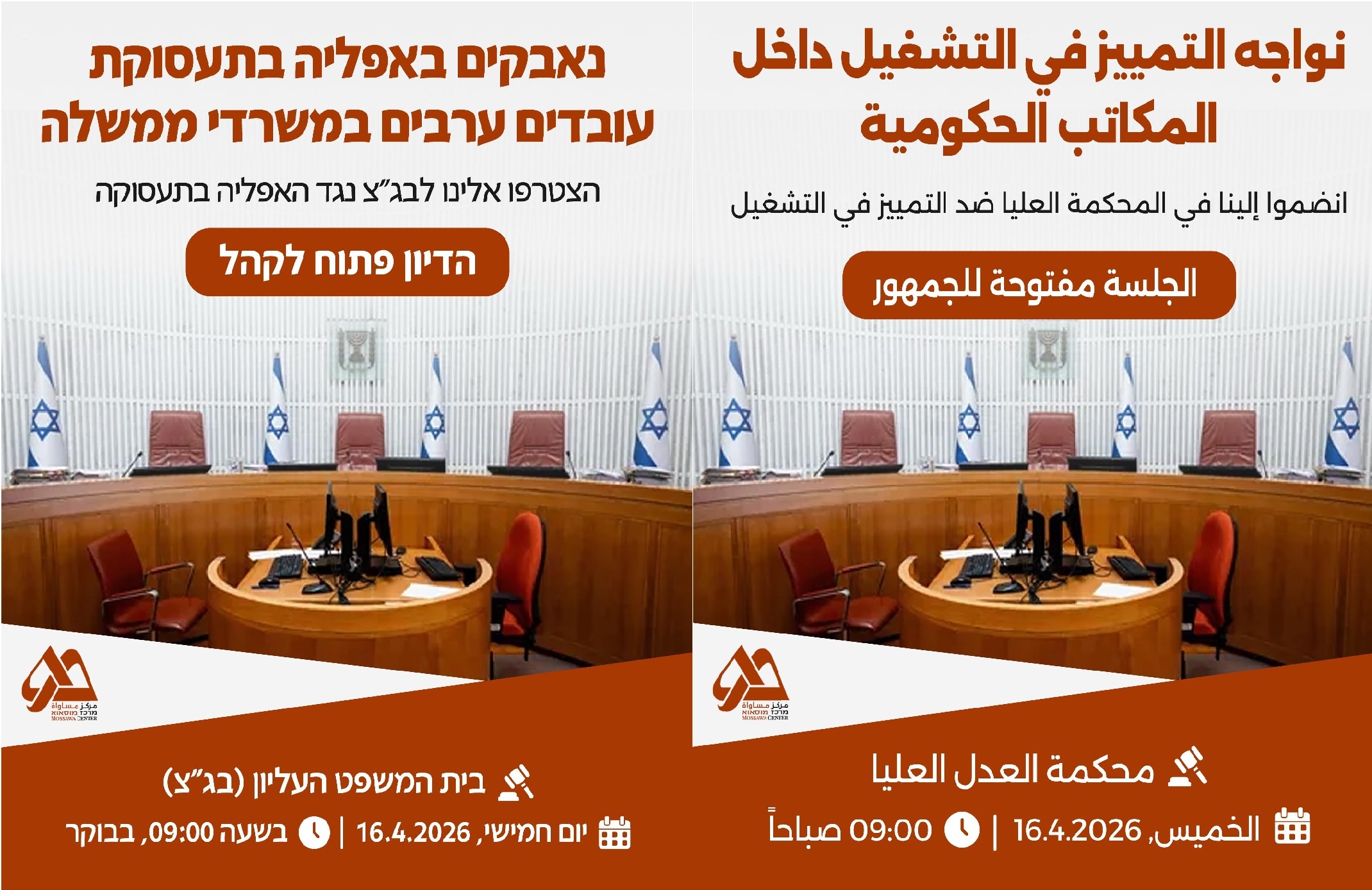 בית המשפט העליון ידון מחר (חמישי) בעתירת מרכז מוסאוא נגד מדיניות האפליה בתעסוקת אזרחים ערבים במשרדי הממשלה, 26 שנים לאחר חקיקת חוק הייצוג ההולם. הדיון יתקיים בפני הרכב של שלושה שופטים, ואת העותרים מייצגים עורכי הדין חוסיין מנאע ומריאן אבו־נאדר.